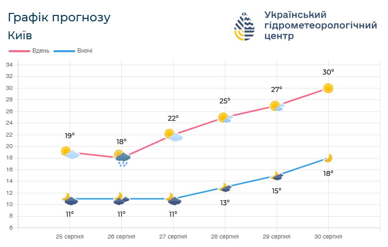Прогноз погоди на Київщині та в місті Києві з 26 по 30 серпня. В понеділок, 26 серпня, очікується проходження атмосферного фронту із заходу, що принесе короткочасні дощі вранці та вдень. Після цього фронту надійде прохолодніше повітря, яке буде найбільш відчутним саме цього дня. З вівторка тиск почне зростати, формуючи поле підвищеної стійкості, що призведе до поступового прояснення неба та припинення опадів до суботи включно. 27 та 28 серпня ночі ще будуть прохолодними, особливо поза межами столиці. Однак, денна температура матиме приємну тенденцію до підвищення, стаючи відчутно вищою з четверга. Найбільш теплою обіцяє бути субота, коли навіть нічна температура стане комфортнішою. Отже, друга половина останнього тижня літа порадує нас хорошою, сонячною погодою. Бажаємо вдалого тижня та приємної погоди кожному!