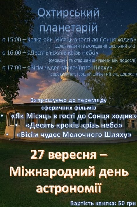 Святкуємо Міжнародний день астрономії 27 вересня! Запрошуємо на захопливі сферичні кіноперегляди, які відкриють таємниці Всесвіту для глядачів будь-якого віку. Це чудова нагода для дітей та дорослих дізнатися більше про космос та насолодитися освітнім контентом.