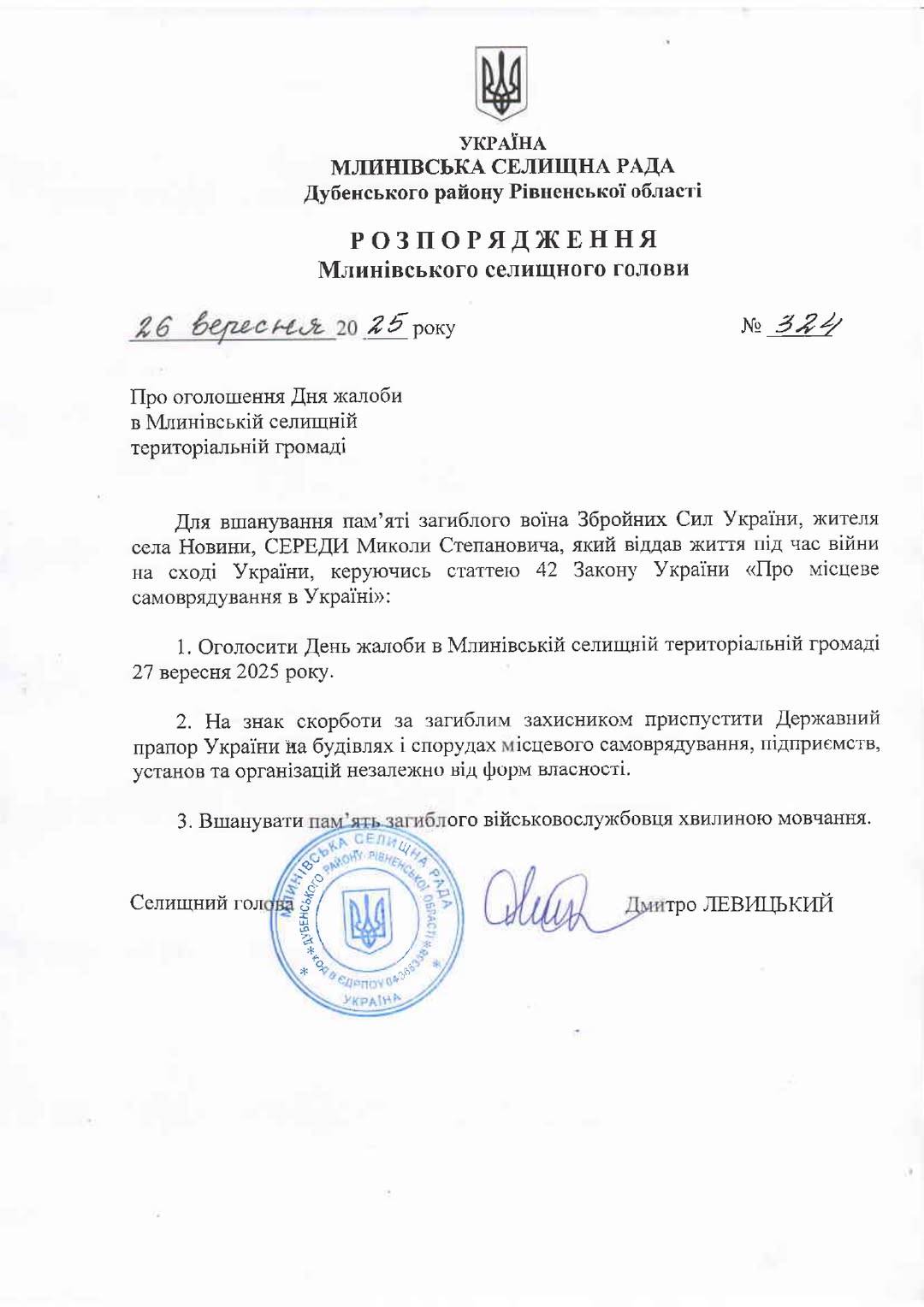 🇺🇦🕯️ 27 вересня 2025 року – це день глибокої жалоби для Млинівської селищної територіальної громади. У цей скорботний день ми вшановуємо пам’ять загиблого Захисника України, нашого земляка, жителя села Новини, Миколи Степановича Середи. Його жертовність та відданість Україні назавжди залишаться в наших серцях. Просимо всіх небайдужих долучитися до прощання з Героєм, гідно провести його в останню дорогу, віддавши належну шану його подвигу. Микола Середа віддав найцінніше за мир та спокій в нашій країні. Вічна пам’ять і царство небесне нашому Герою!