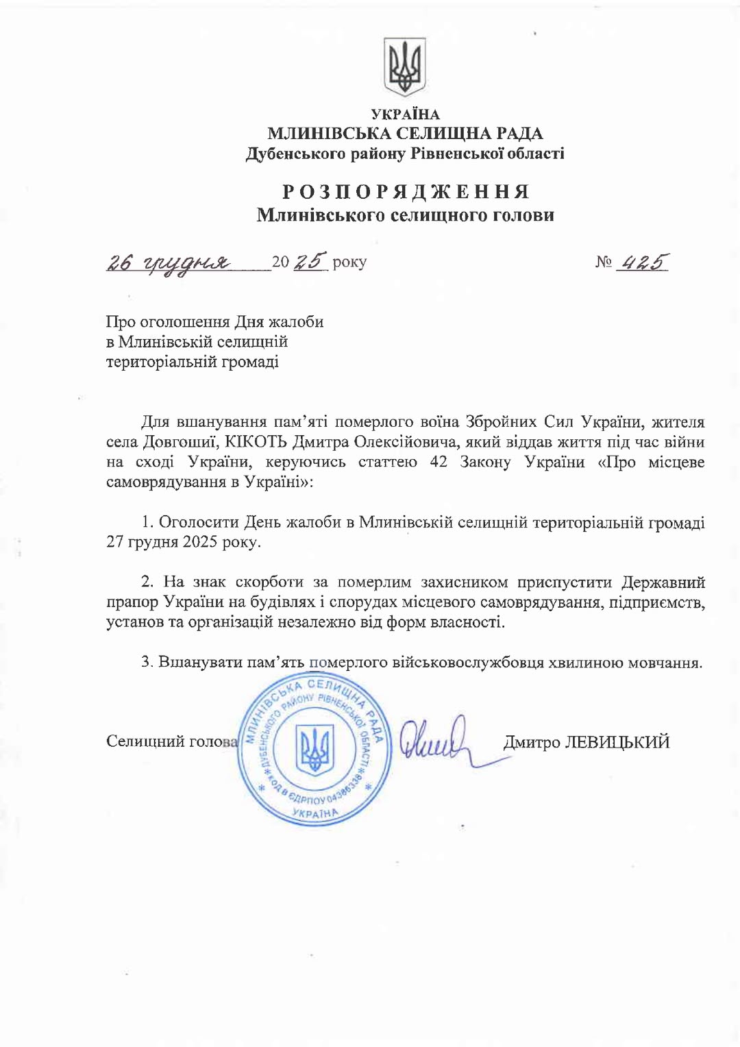 🇺🇦🕯️27 грудня 2025 року – День жалоби у Млинівській селищній територіальній громаді для вшанування пам’яті померлого Захисника України, жителя села Довгошиї, КІКОТЬ Дмитра Олексійовича.