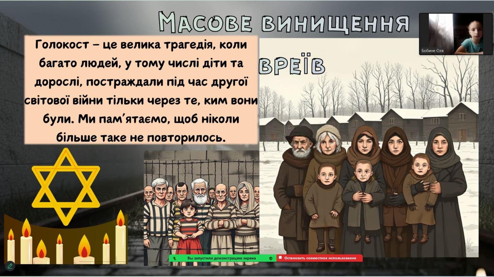 Під час тематичних уроків, виховних годин, інформаційних бесід учні й педагоги говорили про цінність людського життя, небезпеку нетерпимості, дискримінації та байдужості. Пам’ятаючи минуле, ми виховуємо відповідальність за майбутнє — майбутнє без ненависті та насильства.