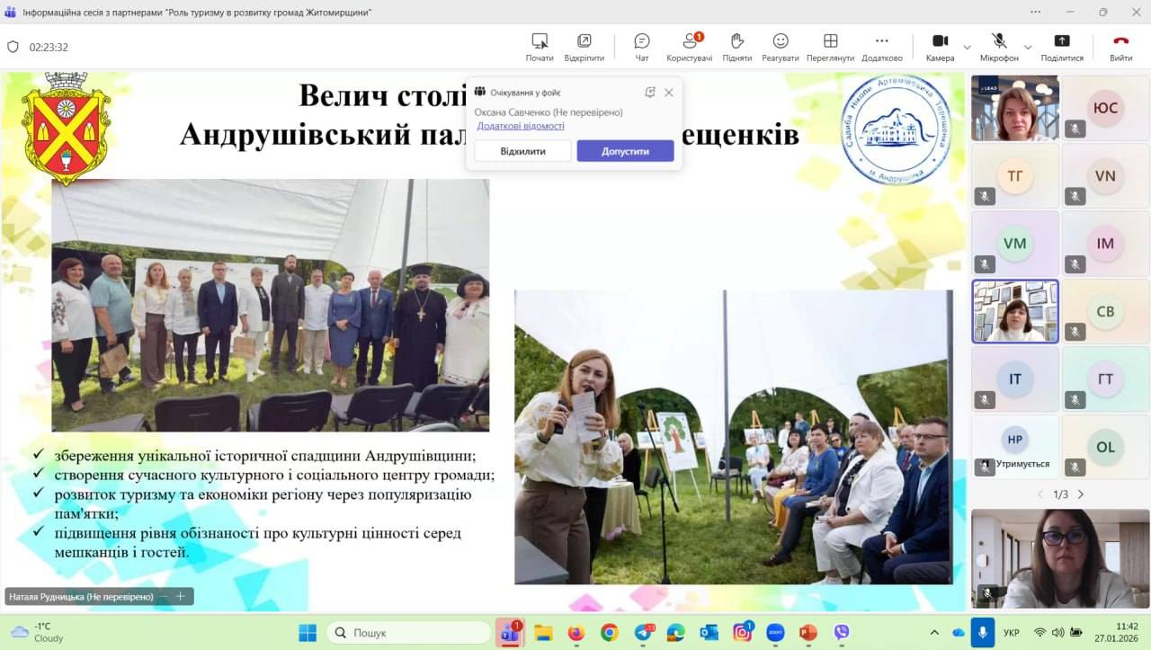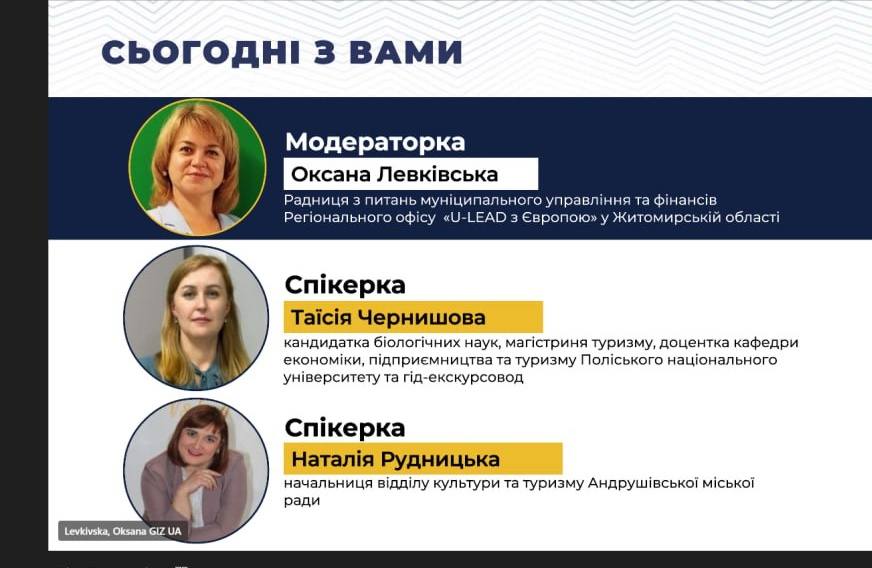 27 січня 2026 року в онлайн-форматі відбулася інформаційна сесія на тему «Роль туризму в розвитку громад Житомирщини», організована з метою посилення спроможності органів місцевого самоврядування використовувати туристичний потенціал як інструмент економічного розвитку та залучення приватних інвестицій.