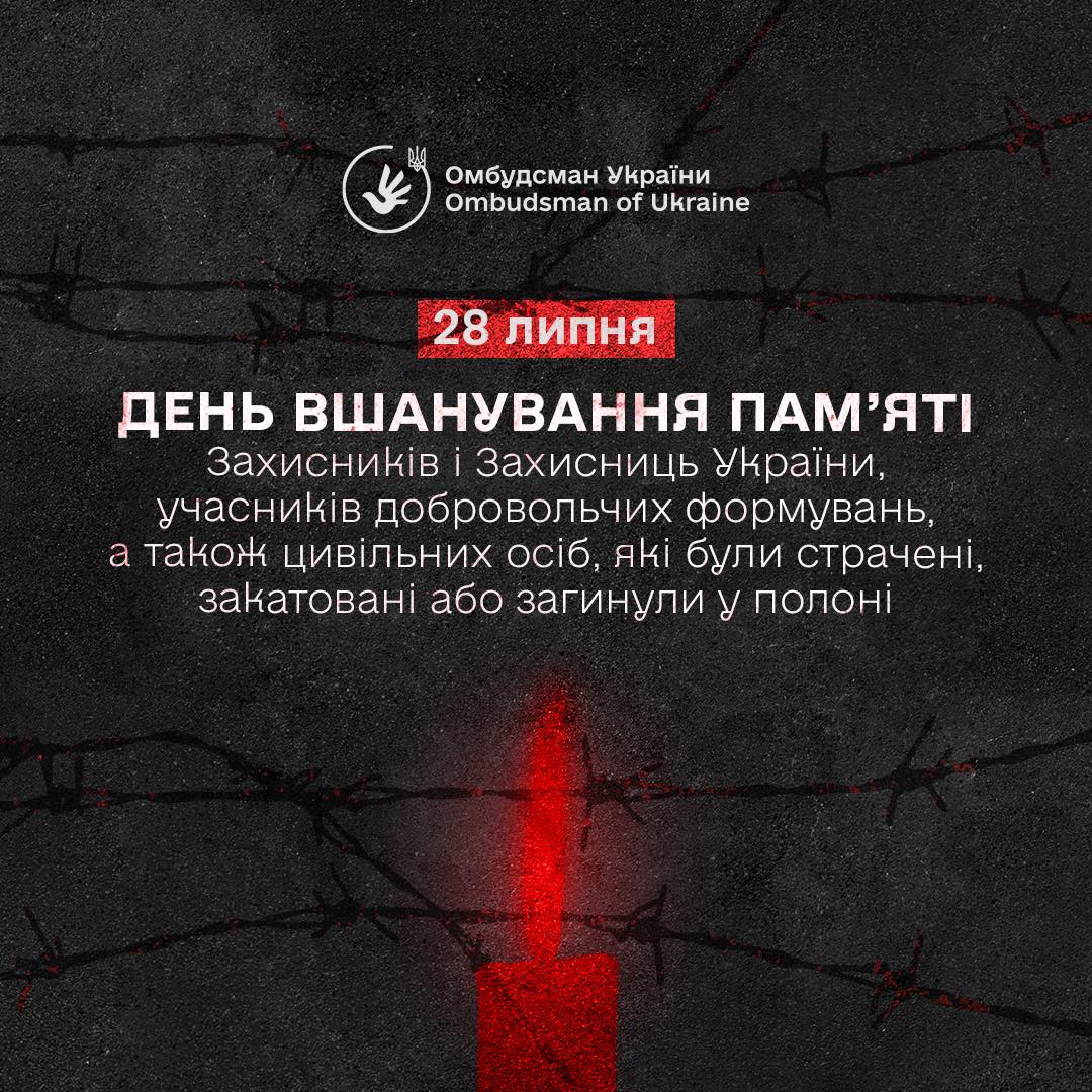 28 липня – День вшанування пам’яті Захисників і Захисниць України, членів добровольчих формувань та цивільних осіб, які були страчені, закатовані або загинули у полоні. Ця пам’ятна дата запроваджена, аби вшанувати всіх, хто загинув у ворожому полоні, відстоюючи свободу та незалежність України. Російська Федерація, держава-агресор, продовжує систематично порушувати норми міжнародного гуманітарного права. Це призводить до загибелі українських військовополонених та незаконно утримуваних цивільних громадян. В умовах російського полону не діють Женевські конвенції, а так звані “Московські конвенції”, які базуються на повній зневазі до людського життя та прав людини. Цей скорботний день покликаний вшанувати пам’ять усіх, хто загинув у нелюдських умовах російського полону. Дата була обрана не випадково: саме в ніч з 28 на 29 липня 2022 року Росія здійснила цинічний терористичний акт у колонії поблизу Оленівки. У тій трагедії, де утримували оборонців “Азовсталі”, загинули щонайменше 53 українських захисники, а понад 130 отримали поранення. Розстріли, нелюдські тортури, страти – це цілеспрямовані, усвідомлені дії агресора, спрямовані проти людяності. Ми пам’ятаємо кожного загиблого, кожну загиблу. Ми продовжуємо боротьбу за повернення додому кожного українця та українки, хто досі перебуває у ворожому полоні. Слава Героям, які віддали життя за Україну! Вічна пам’ять загиблим! Щирі співчуття родинам, які втратили своїх найрідніших!