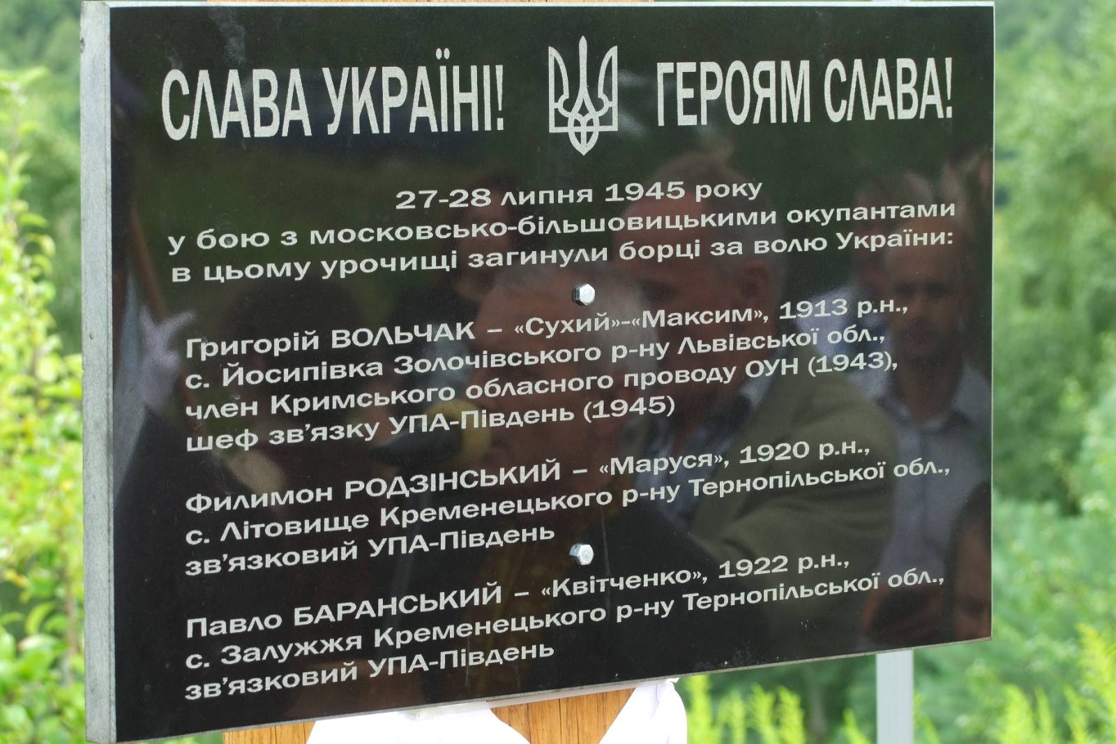 Події розгорнулися у лісовому урочищі 27 та 28 липня 1945 року. У цьому місці, опинившись в оточенні чисельних більшовицьких військ, полягли в бою справжні герої: Григорій Вольчак, шеф зв’язку УПА-Південь, родом із села Йосипівка; Павло Баранський, зв’язковий УПА-Південь, із села Залужжя; та Филимон Родзінський, також зв’язковий УПА-Південь, із села Літовище. Їхня відвага та самопожертва стали прикладом для майбутніх поколінь.
