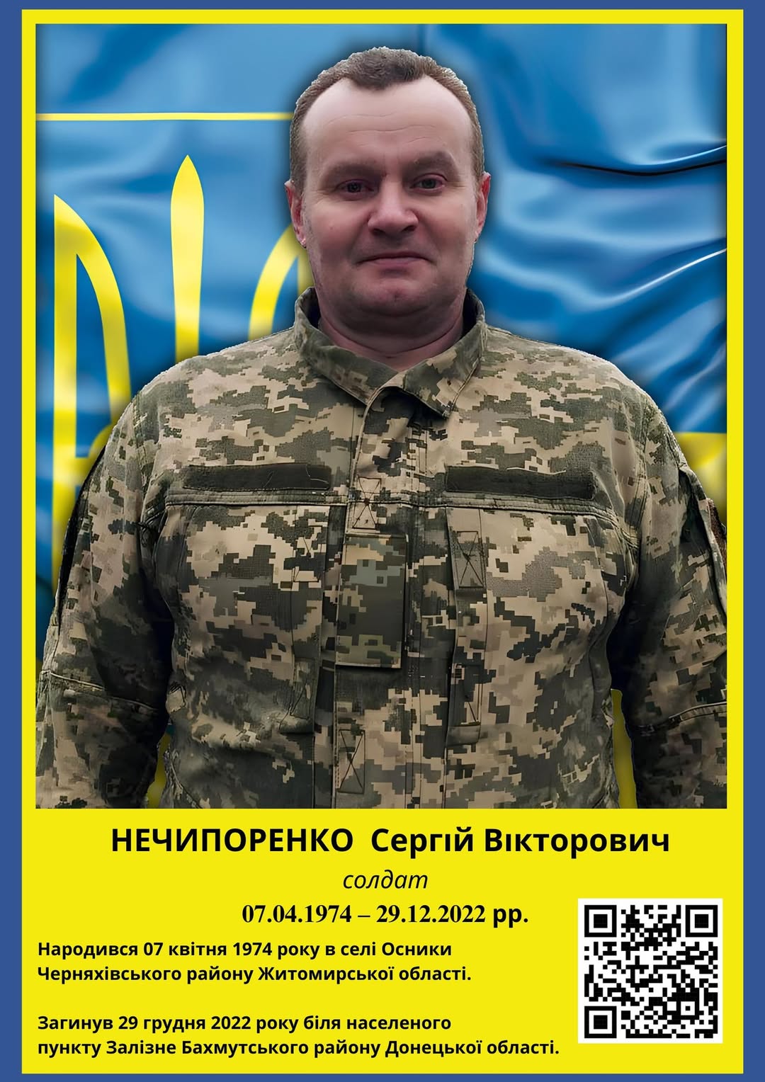 29 грудня 2022 року під час запеклого бою біля н.п. Залізне Бахмутського району на Донеччині, до останнього подиху залишившись вірним військовій присязі, солдат ЗСУ Сергій Нечипоренко загинув як Герой.