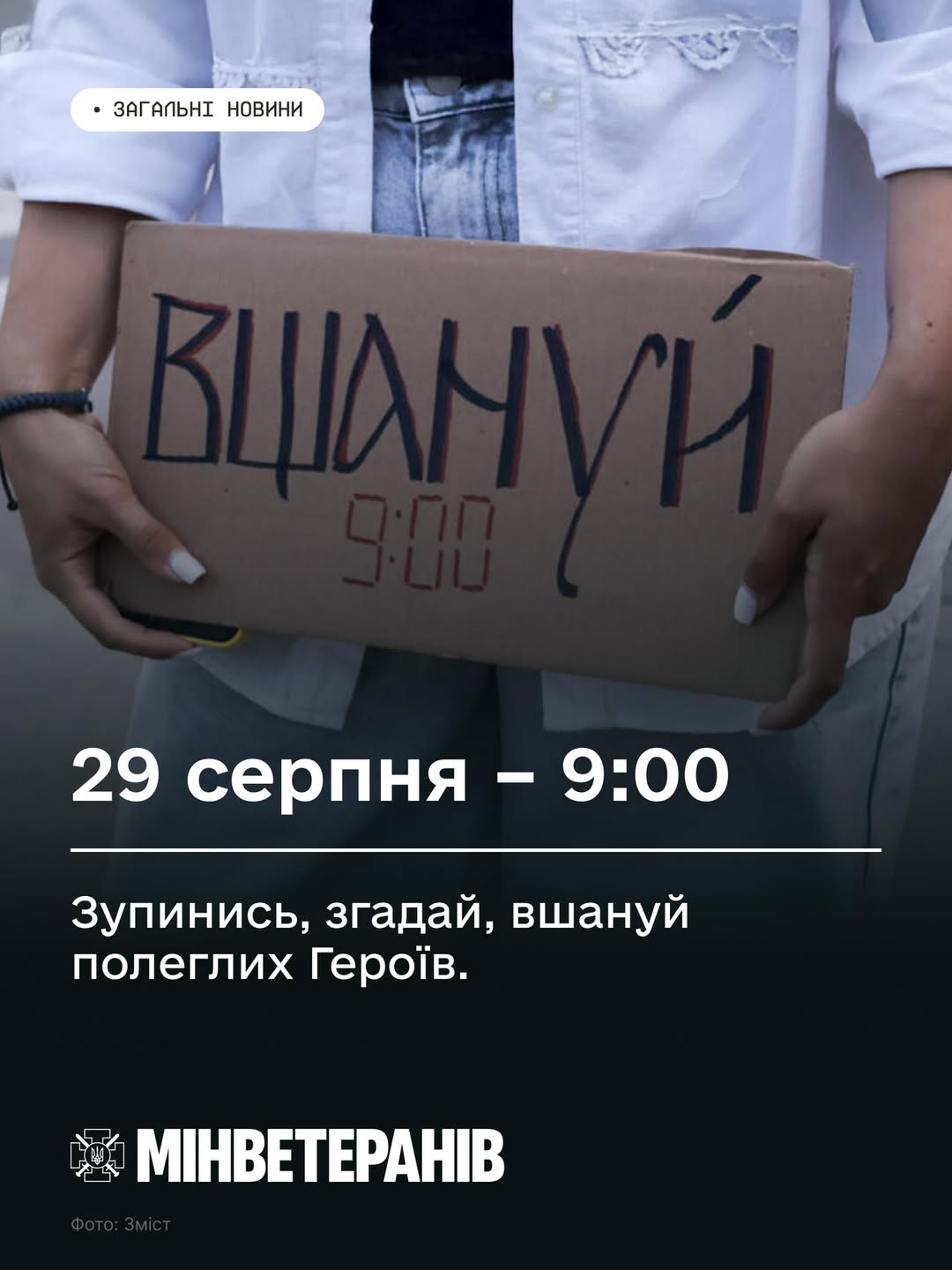 ❗️ Завтра, 29 серпня, о 09:00 приєднаймося до Загальнонаціональної хвилини мовчання. Це наш спільний обов’язок – віддати шану Захисникам і Захисницям, які поклали своє життя за наше сьогодення та можливість продовжувати боротьбу за вільну Україну.