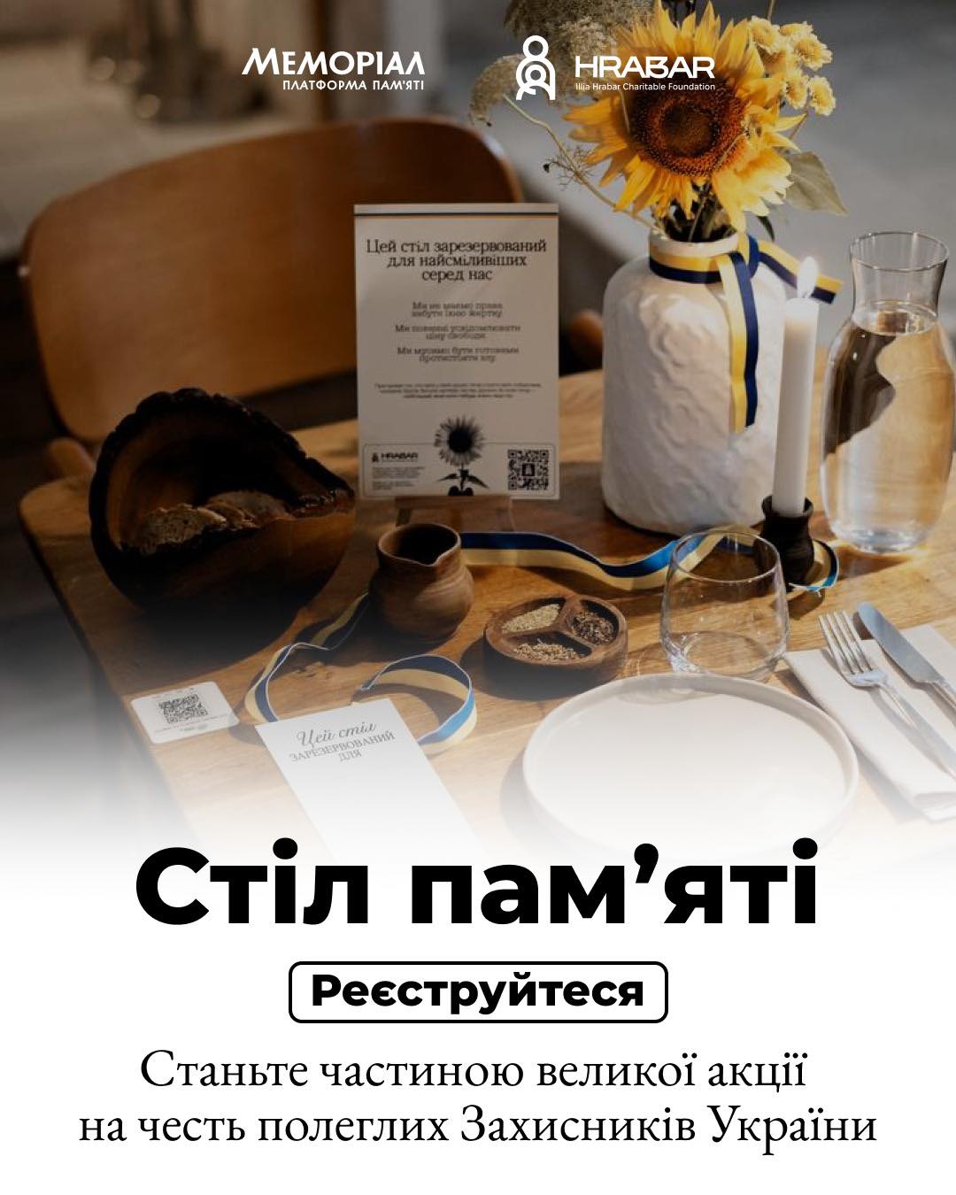 Благодійний фонд імені Іллі Грабара у партнерстві з Платформою пам’яті Меморіал, яка співпрацює з Київською міською військовою адміністрацією у сфері вшанування полеглих героїв, запрошують до участі у всеукраїнській акції «Стіл пам’яті». До ініціативи можуть приєднатися ресторани, кафе, кав’ярні, військові підрозділи, освітні установи, книгарні та бібліотеки Києва.