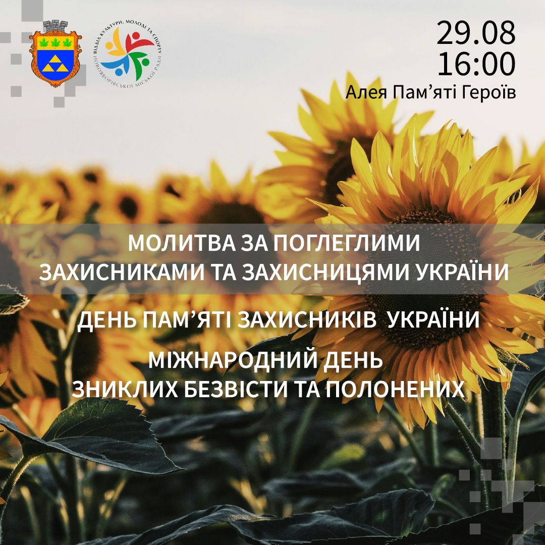 29 серпня, у День пам’яті Захисників України, які загинули в боротьбі за незалежність, суверенітет і територіальну цілісність нашої держави, запрошуємо всіх долучитися до спільної молитви на Алеї пам’яті Героїв. Це особливий день, коли ми вшановуємо відвагу та жертовність тих, хто віддав своє життя за мирне майбутнє України. 🕯 Початок заходу заплановано на 16:00 за адресою: Алея пам’яті Героїв. У цей день ми особливо згадуємо трагічні події Іловайського котла — одну з найболючіших сторінок сучасної історії України. У серпні 2014 року, під час цих жорстоких боїв, загинули сотні наших воїнів, а багато з них досі вважаються зниклими безвісти. Їхня відвага та самопожертва назавжди залишаться в наших серцях. Напередодні Міжнародного дня зниклих безвісти, який у світі відзначають 30 серпня, ми згадаємо в молитві всіх зниклих безвісти та полонених. Ми вшануємо їхню пам’ять та нагадаємо: ви не забуті! Ваша боротьба не була марною. 🙏 Нехай ця спільна молитва стане потужним актом єднання, виразом глибокої вдячності та незламної надії на майбутнє. Запрошуємо всіх небайдужих громадян долучитися до цього важливого заходу. Разом ми сильніші, разом ми переможемо. Герої не вмирають. Ми пам’ятаємо. Ми шануємо. Ми віримо в перемогу.
