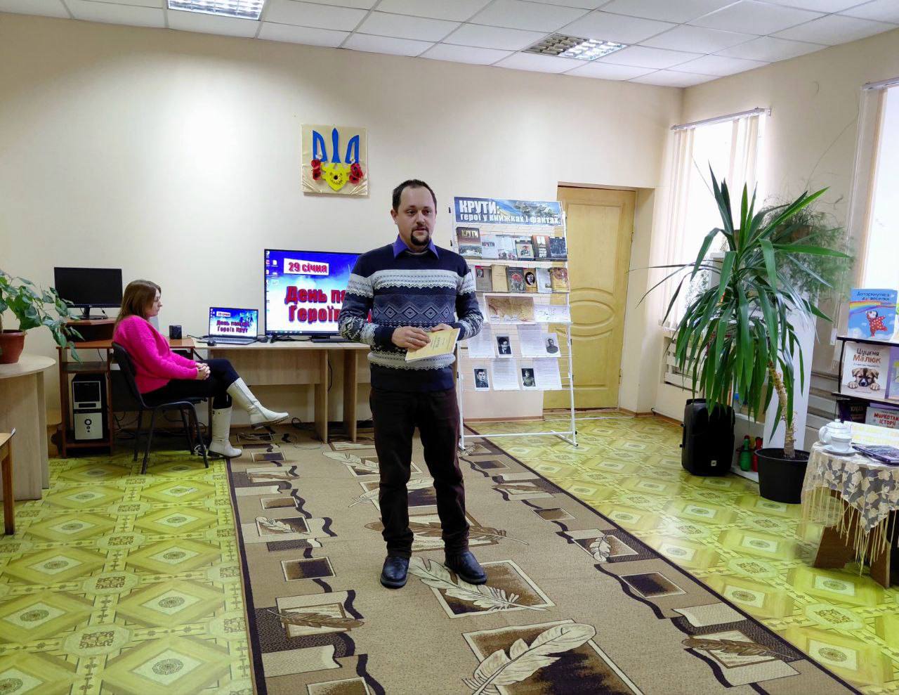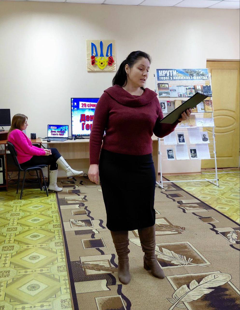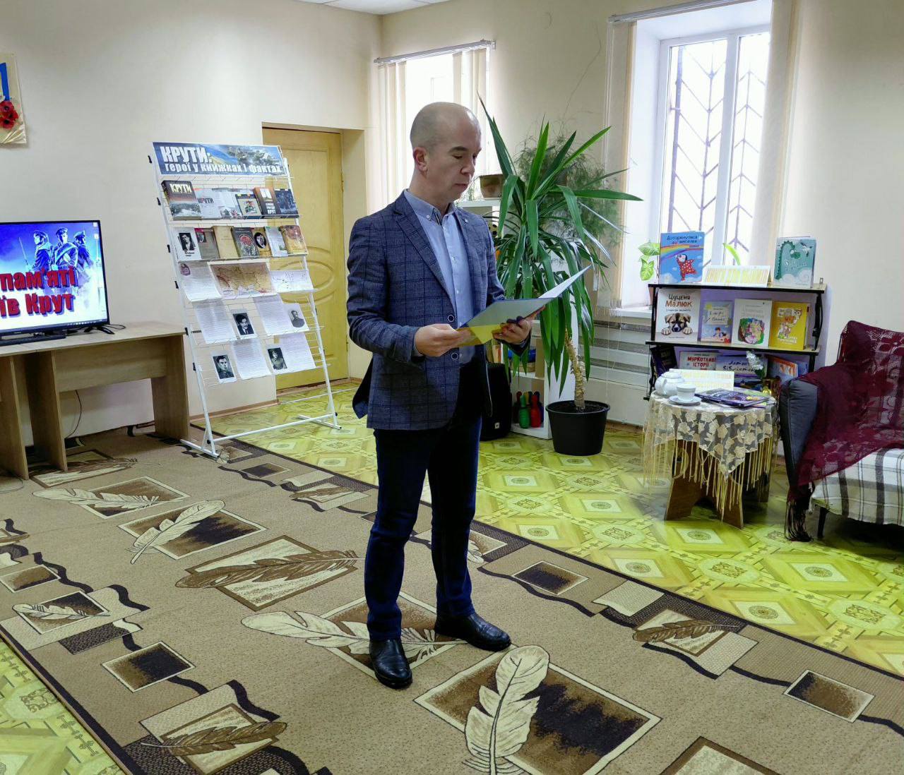 Ведуча заходу, бібліотекар Алла Коновалова розпочала зустріч словами про неоціненність подвигу крутянців, їхню мужність і жертовність в ім’я України. Захід відкрився виконанням Гімну України, після чого присутні хвилиною мовчання вшанували пам’ять усіх, хто загинув за незалежність нашої держави.