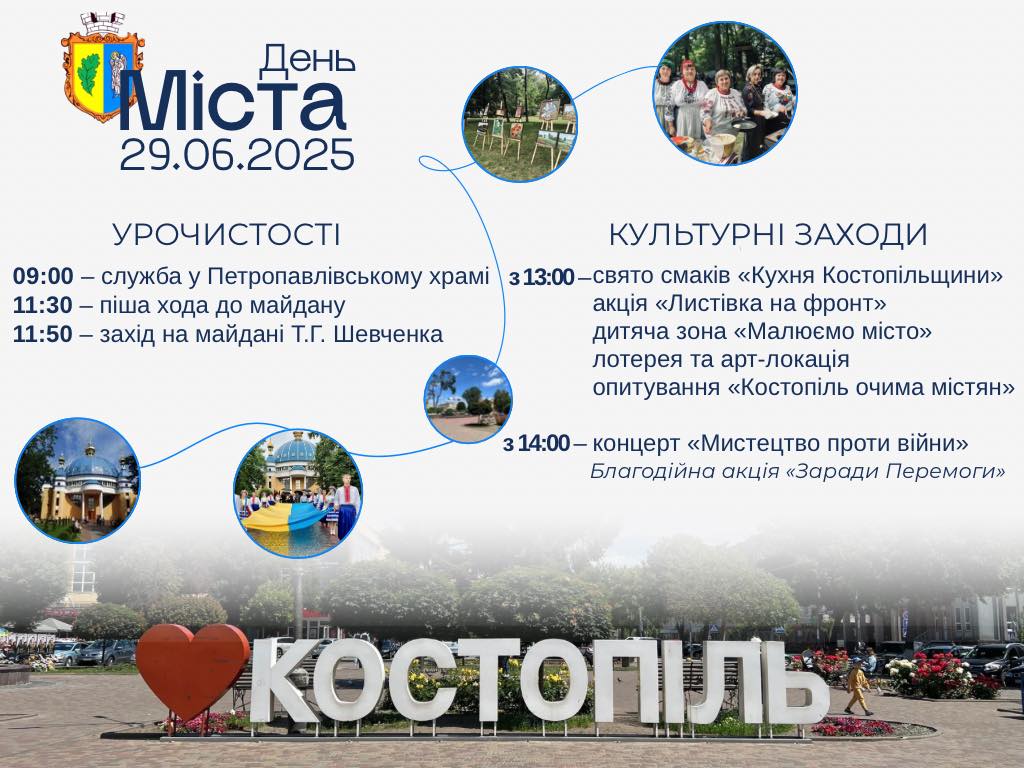 У неділю, 29 червня, у день апостолів Петра і Павла, Костопіль відзначить своє 242-річчя. Уже традиційно День міста Костопіль відзначає у храмове свято. Після переходу ПЦУ на григоріанський календар дата свята змістилася на 13 днів, тому з 2024 року День міста в Костополі святкуємо не 12 липня, як раніше, а 29 червня.