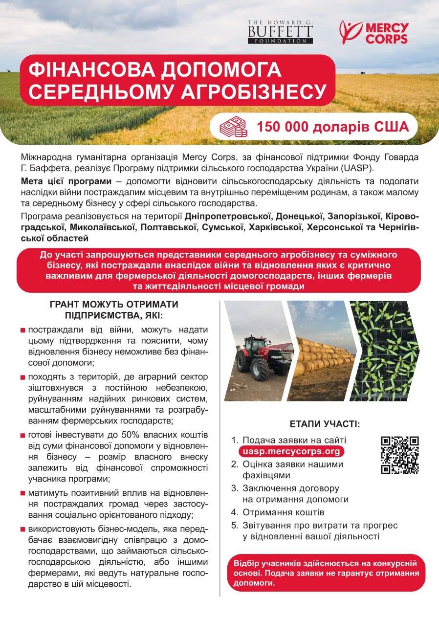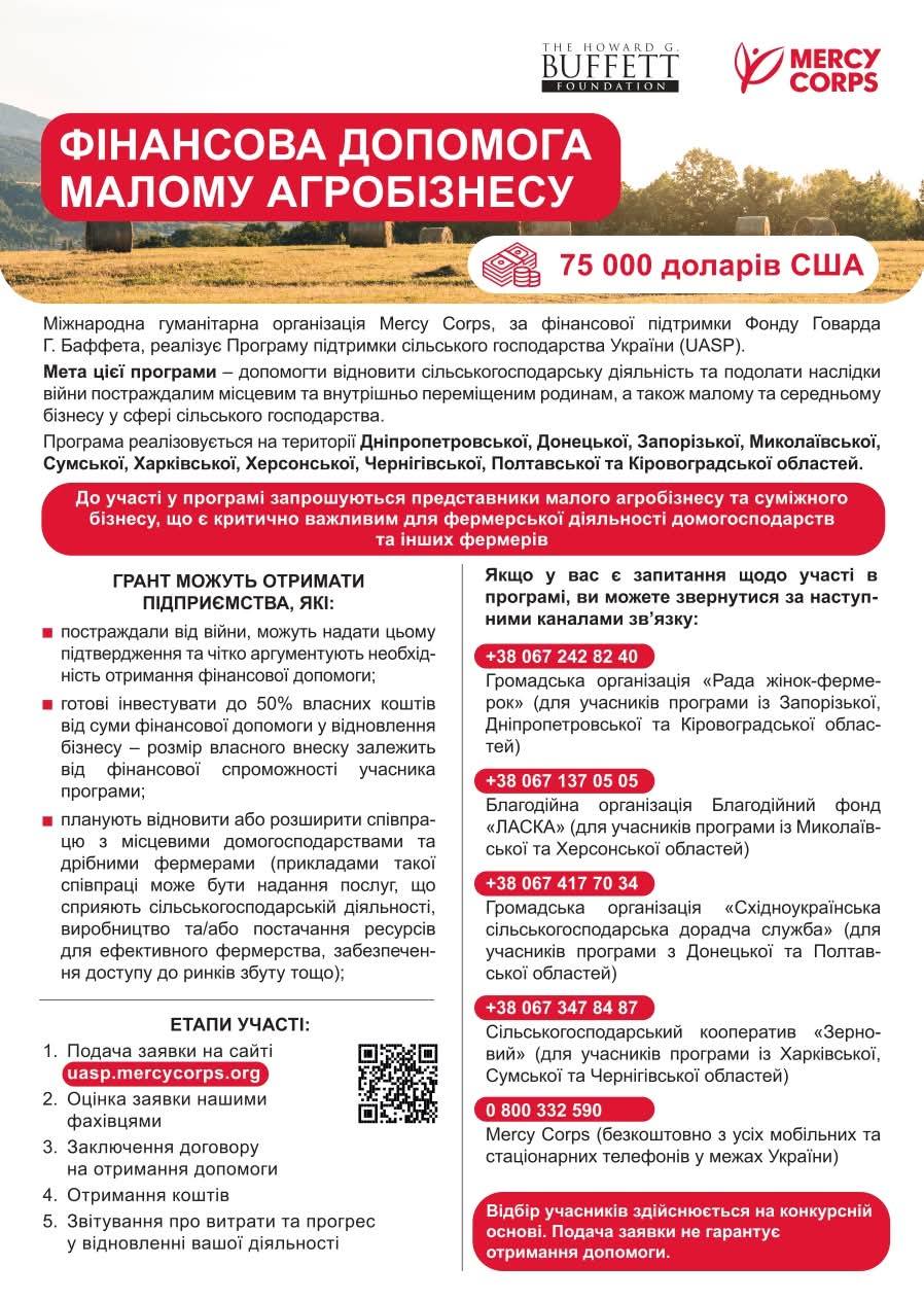 ➡️ Фінансова допомога надається в рамках Програми підтримки сільського господарства України, яку реалізує міжнародна гуманітарна організація Mercy Corps за сприяння Фонду Говарда Г. Баффета.