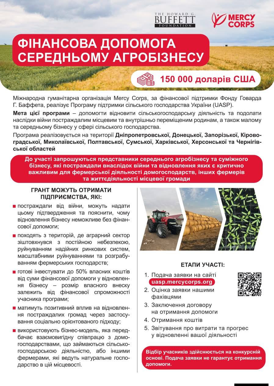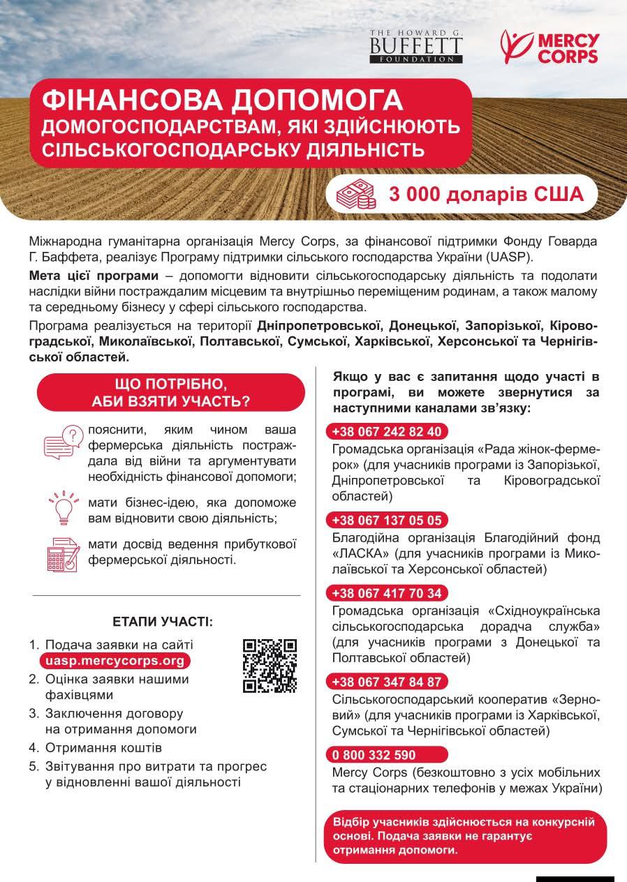 ➡️Фінансова допомога надається в рамках Програми підтримки сільського господарства України, яку реалізує міжнародна гуманітарна організація Mercy Corps за сприяння Фонду Говарда Г. Баффета.