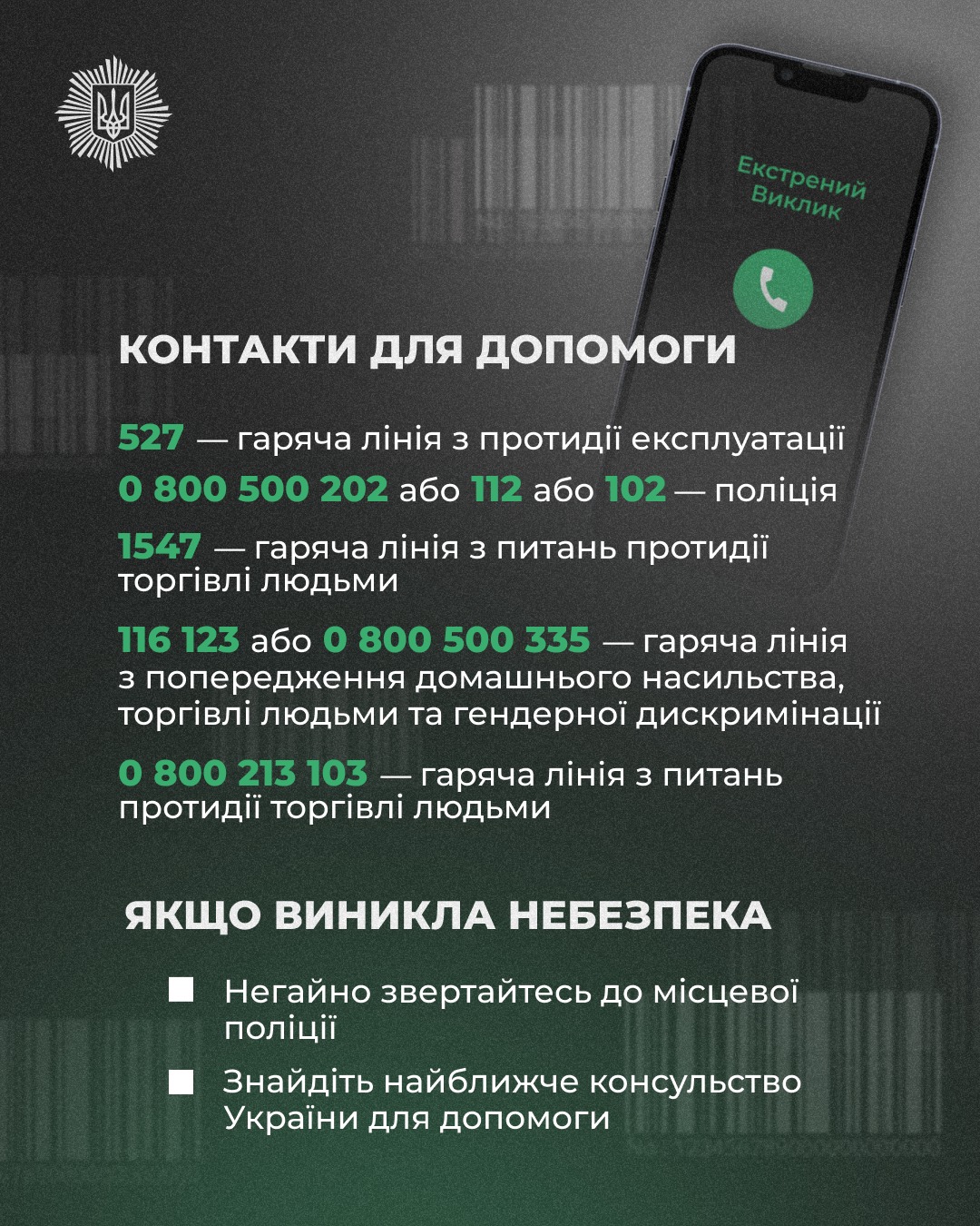 Якщо ви стали свідком торгівлі людьми, або підозрюєте, що хтось поруч із вами може бути в небезпеці, не залишайтеся байдужими! Ваш голос, ваша небайдужість та ваша готовність повідомити про підозрілі обставини можуть врятувати чиєсь життя. Звертайтеся до правоохоронних органів або громадських організацій, які надають допомогу постраждалим. Пам’ятайте, що мовчання може коштувати комусь свободи та життя. Ми повинні діяти разом, щоб викорінити це злочинне явище та забезпечити безпеку для всіх.