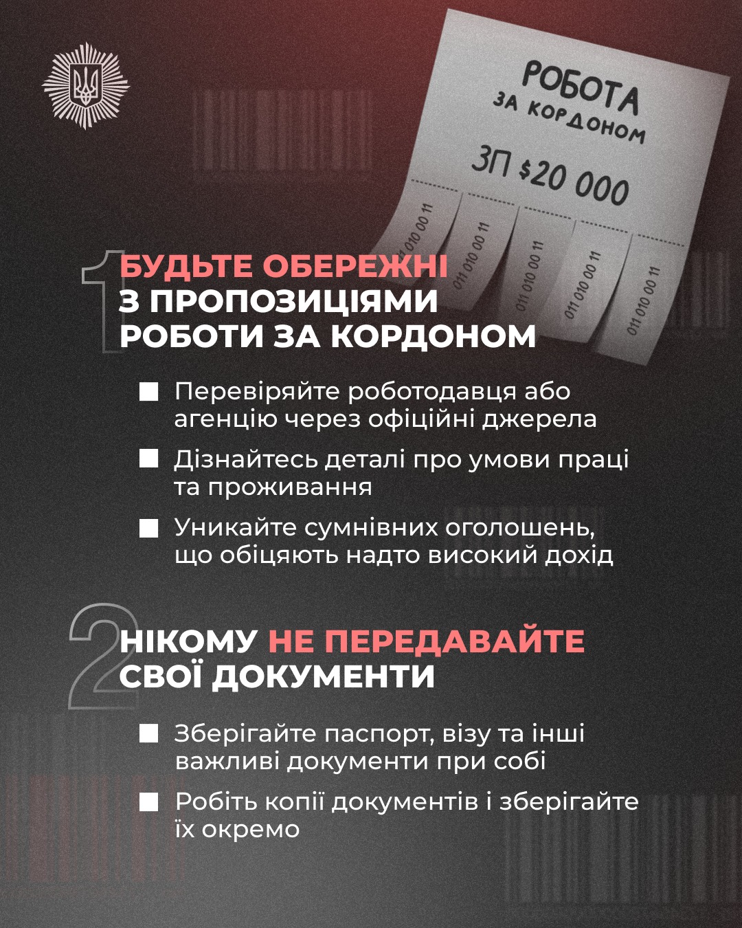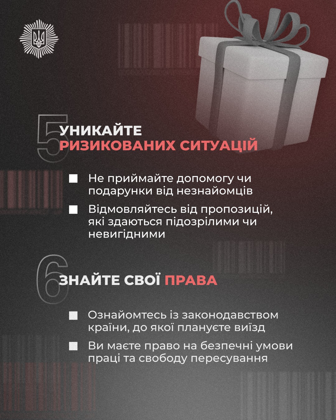 30 липня — Всесвітній день боротьби із торгівлею людьми. Цей день покликаний привернути увагу до однієї з найсерйозніших проблем сучасності — торгівлі людьми, яка є сучасною формою рабства. Вона порушує фундаментальні права та свободи мільйонів людей по всьому світу. Особливо високі ризики стають очевидними під час пошуку роботи та працевлаштування. Нелегальна зайнятість, відсутність офіційного договору, співпраця з сумнівними агенціями чи роботодавцями — це тривожні сигнали, які можуть вказувати на потенційну небезпеку. Кожен з нас повинен усвідомлювати ці ризики. Торгівля людьми — це злочин, який не має виправдання. Наше найголовніше завдання сьогодні — це захистити кожного громадянина від сучасних работорговців. Важливо пам’ятати, що існують схеми, які можуть ввести в оману як чоловіків, так і жінок, а також дітей. Люди можуть потрапити у пастку обіцянок легких грошей, хорошої роботи за кордоном або кращого життя. Однак, наслідки можуть бути катастрофічними: примусова праця, сексуальна експлуатація, викрадення органів. З метою боротьби з торгівлею людьми, важливо підвищувати обізнаність суспільства. Знання про те, як розпізнати ознаки торгівлі людьми та куди звертатися по допомогу, може врятувати життя. Не мовчіть, якщо ви стали свідком або підозрюєте, що хтось потрапив у пастку торгівлі людьми! Ваша небайдужість, ваша активна позиція та ваша готовність повідомити про підозрілі обставини можуть стати вирішальними у порятунку чийогось життя. Поширення інформації про цей день та про методи боротьби з торгівлею людьми є внеском кожного у створення безпечнішого суспільства. Пам’ятайте, що боротьба з торгівлею людьми – це спільна відповідальність.