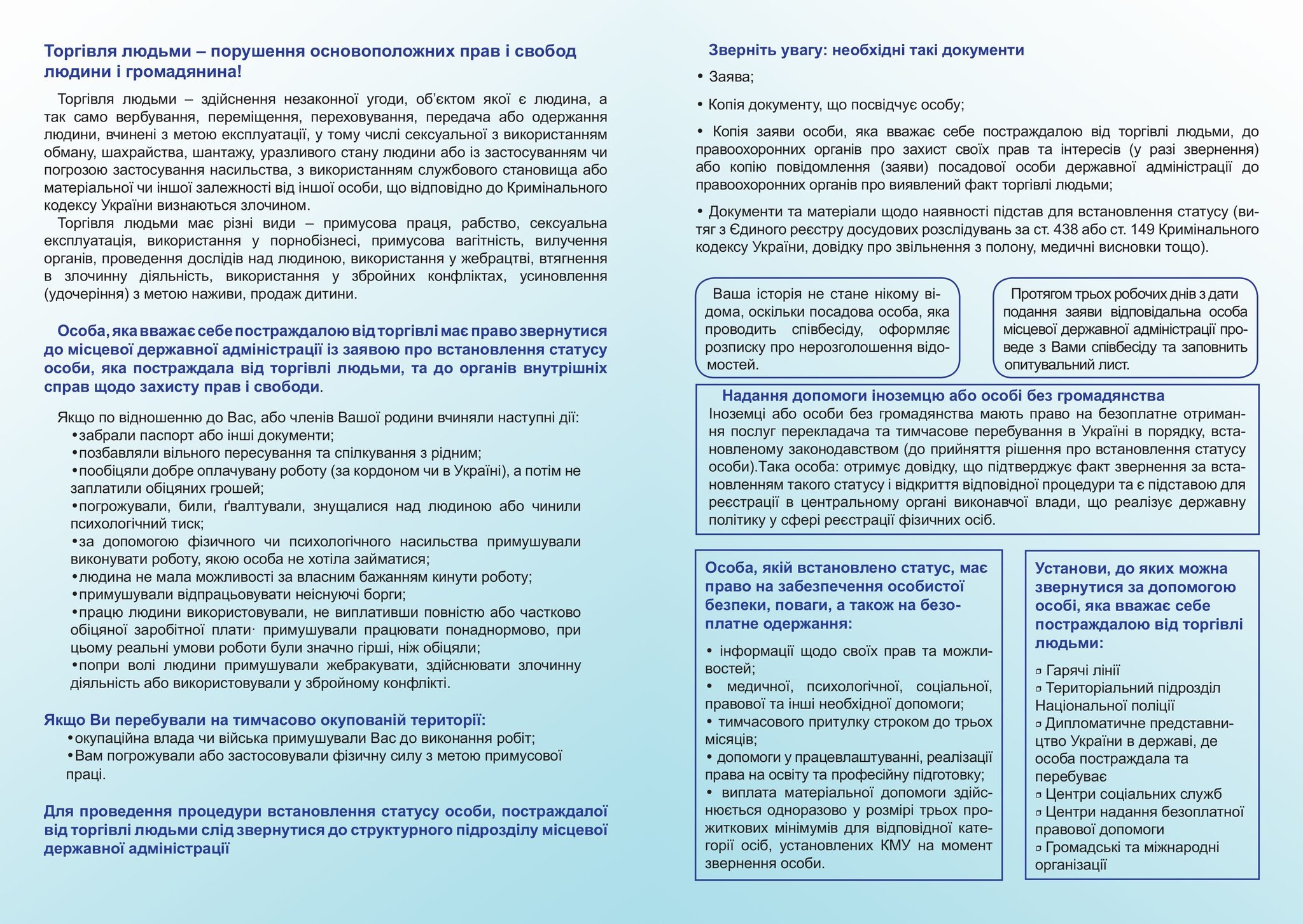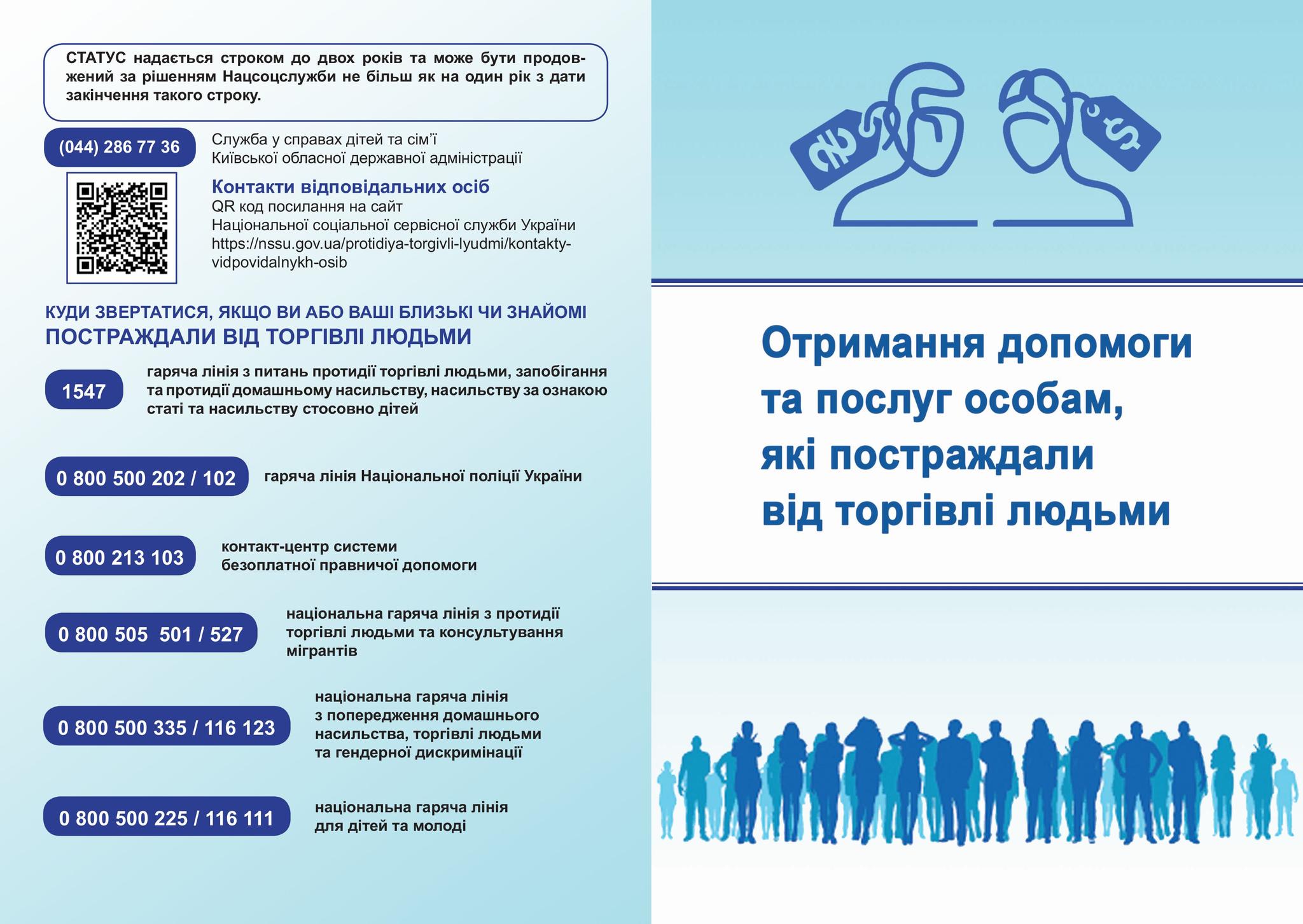 Якщо ви або ваші близькі стали жертвою або свідком злочинів, пов’язаних із торгівлею людьми, не залишайтеся наодинці з цією проблемою. Звертайтеся по допомогу. Існують спеціальні служби підтримки, які готові надати консультацію та допомогу. Ваша безпека та безпека ваших близьких — понад усе. Пам’ятайте, що обізнаність та своєчасне звернення по допомогу є найкращим захистом від цієї небезпечної діяльності.