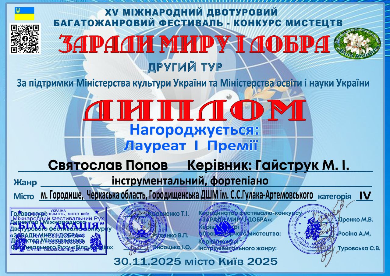 🎹 Святослав Попов — 1 місце (номінація фортепіано)