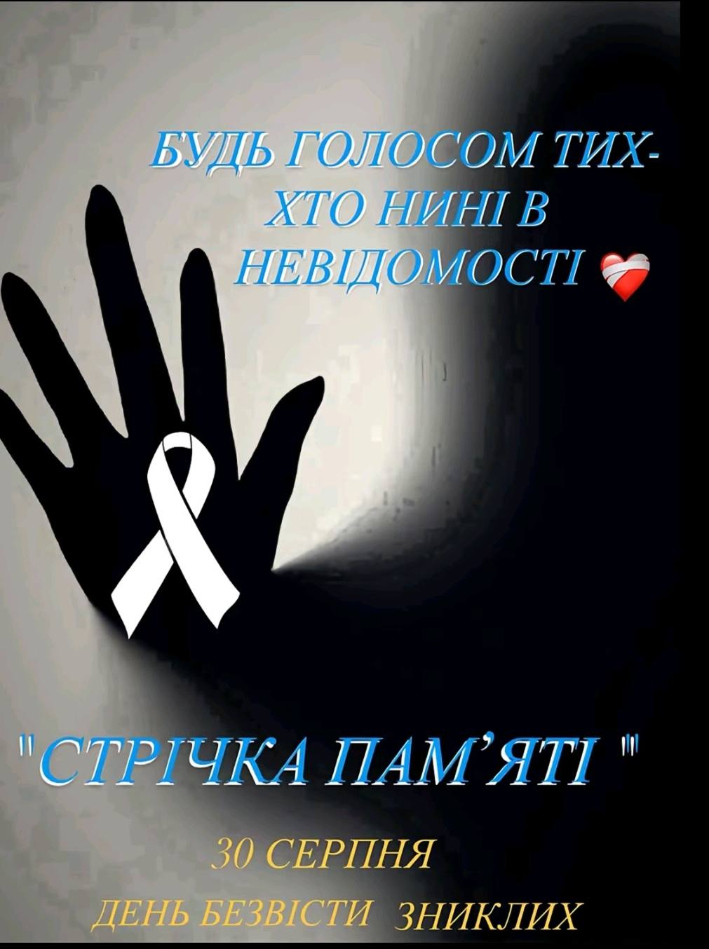 30 серпня – Міжнародний день зниклих безвісти. Цей день несе особливий біль для України, адже тисячі родин живуть у невизначеності, в щоденному чеканні звістки про своїх найдорожчих. Згідно з офіційними даними, понад 26 тисяч українців вважаються зниклими безвісти внаслідок війни. Серед них – наші відважні воїни, які боронили незалежність держави, цивільні, що стали жертвами жорстокої окупації, і навіть діти, доля яких досі залишається невідомою. Для родичів кожна хвилина перетворюється на боротьбу між міцною вірою та глибоким відчаєм. Однак вони не втрачають надії, адже справжня любов є сильнішою за будь-яку невідомість. Вони не зникли – вони існують у серцях близьких, у щирих молитвах матерів, у тиші домівок, що з нетерпінням чекають на повернення рідних. Наш священний обов’язок – пам’ятати про кожного, активно шукати зниклих та незламно вірити, що всі, хто може, повернуться до своїх домівок. Ми схиляємо голови перед родинами, які перебувають у процесі очікування. Україна відчуває ваш біль і стоїть разом із вами.