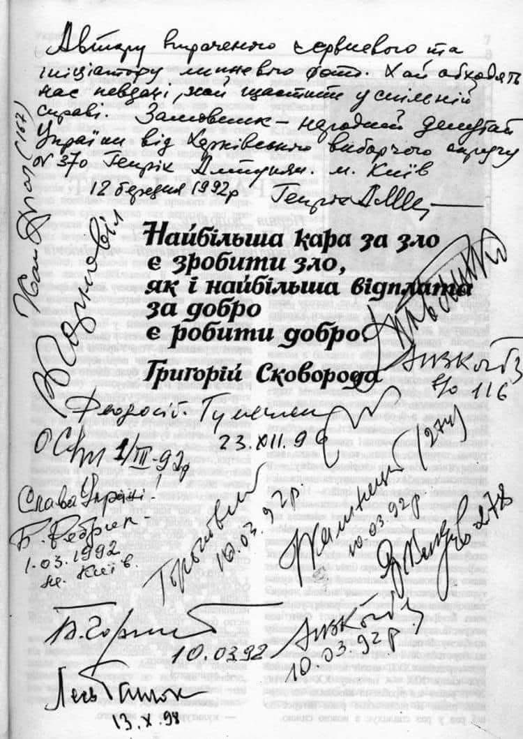 — Дорогі мої! Сьогодні тільки перший крок. Не тішмо себе ілюзіями. Декларація — це лише декларація. Щоб кожна її фраза обросла живими м’язами, щоб сталася нова українська Конституція, щоб були вироблені нові закони на основі цієї Декларації — нас чекає велика і важка боротьба!..