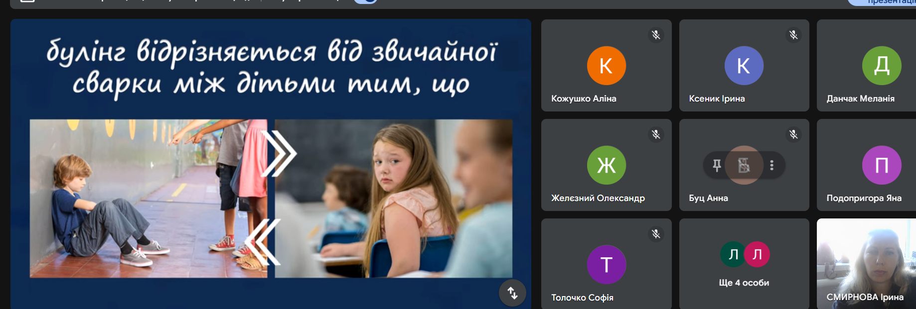Ірина СМИРНОВА, практичний психолог та Наталя КОРОЛЬОВА, соціальний педагог, провели профілактичні заходи з метою ознайомлення здобувачів освіти із поняттям, формами та структурою булінгу; виховання почуття емпатії та переживання дитини, яка зазнає насильства; розвитку вміння пошуку шляхів виходу зі складної ситуації; формування навичок відповідальної та безпечної поведінки у закладі освіти.