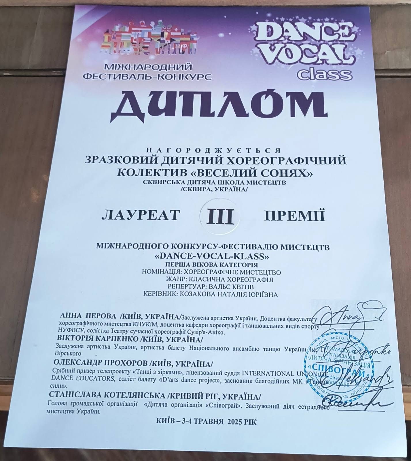 4 травня 2025 року в Києві відбувся Міжнародний фестиваль-конкурс “Dance Vocal Class”, де зразковий дитячий хореографічний колектив “Веселий Сонях” зі Сквирської громади здобув вражаючі нагороди. Художній керівник та викладач колективу — Козакова Наталія Юріївна. Цей конкурс став чудовою нагодою для юних талантів продемонструвати свою майстерність та здобути визнання на високому рівні.