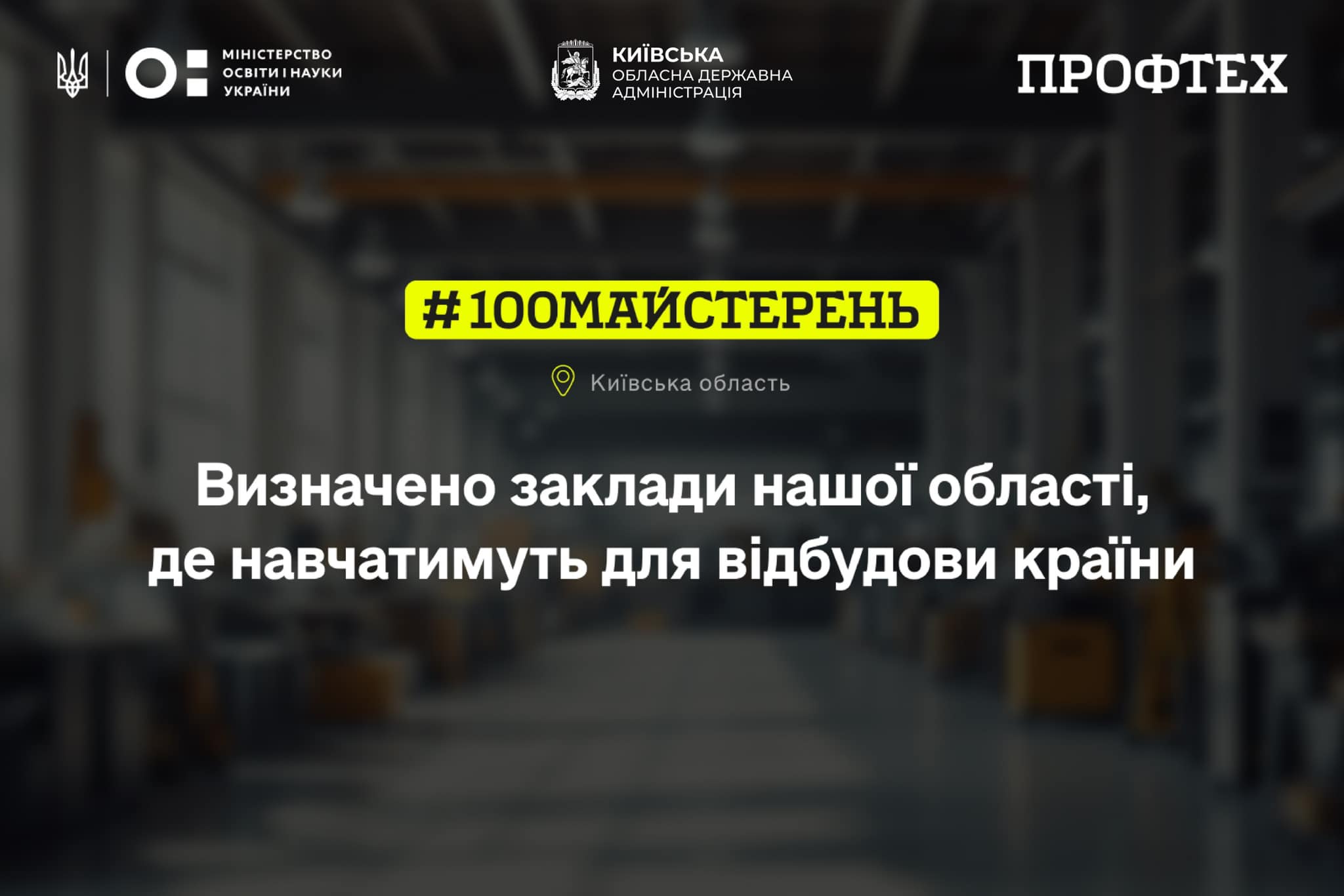У рамках проєкту #100майстерень, ініційованого Міністерством освіти і науки України, триває активне оновлення навчально-практичної бази закладів професійно-технічної освіти Київської області. Загалом сім закладів отримають фінансування для модернізації своїх майстерень, що сприятиме покращенню якості професійної освіти та підготовки кваліфікованих кадрів.