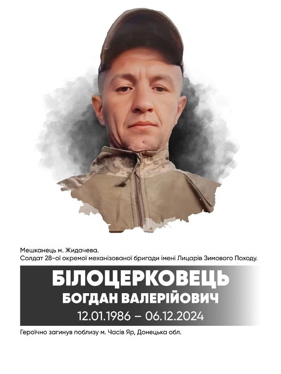 Солдат 28-ї окремої механізованої бригади імені Лицарів Зимового Походу Богдан Білоцерковець загинув у бою за рідну землю 6 грудня 2024 року в районі населеного пункту Часів Яр Бахмутського району Донецької області.