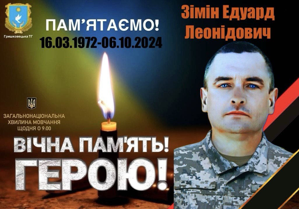 6 жовтня 2025 року минає річниця від дня загибелі Героя України, нашого земляка, жителя селища Гришківці Зіміна Едуарда Леонідовича. Ця сумна дата нагадує нам про незламність духу та найвищу ціну, яку платять наші захисники за мирне небо.