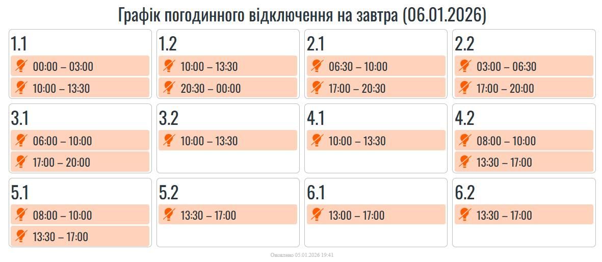 Завтра, 6 січня, в усіх регіонах України, в тому числі на Прикарпатті, будуть застосовуватися графіки погодинних вимкнень.
