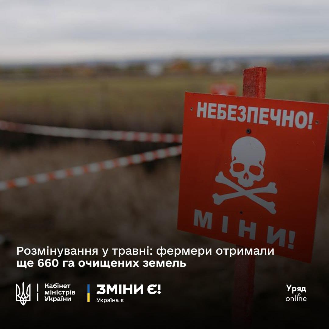 У травні фермери, які подали заявки на участь у державній програмі компенсацій розмінування сільськогосподарських земель, отримали 660 га угідь, очищених від мін та вибухівки. Це важливий крок для підтримки аграрного сектору та відновлення продуктивності земель, що постраждали від бойових дій.