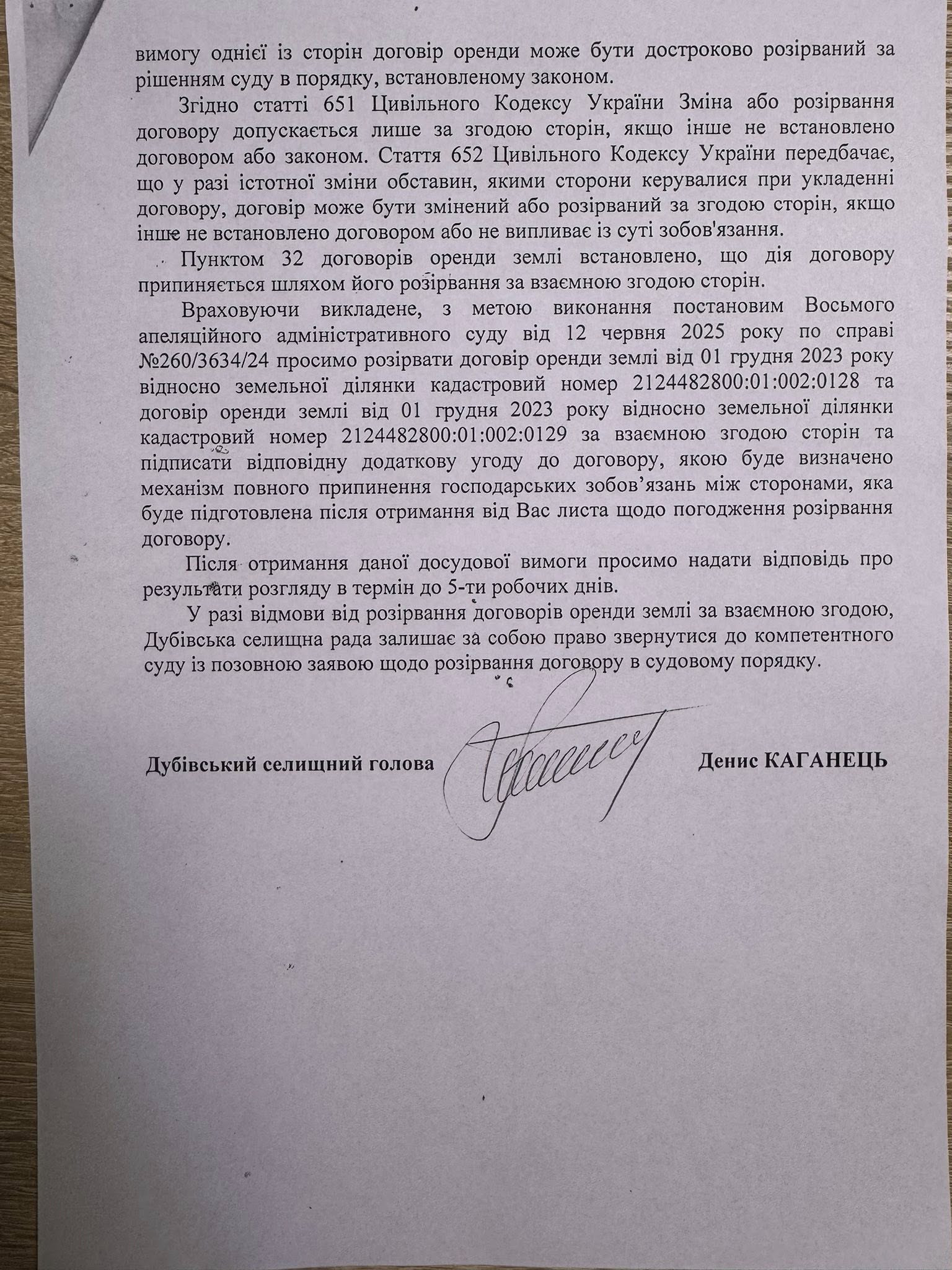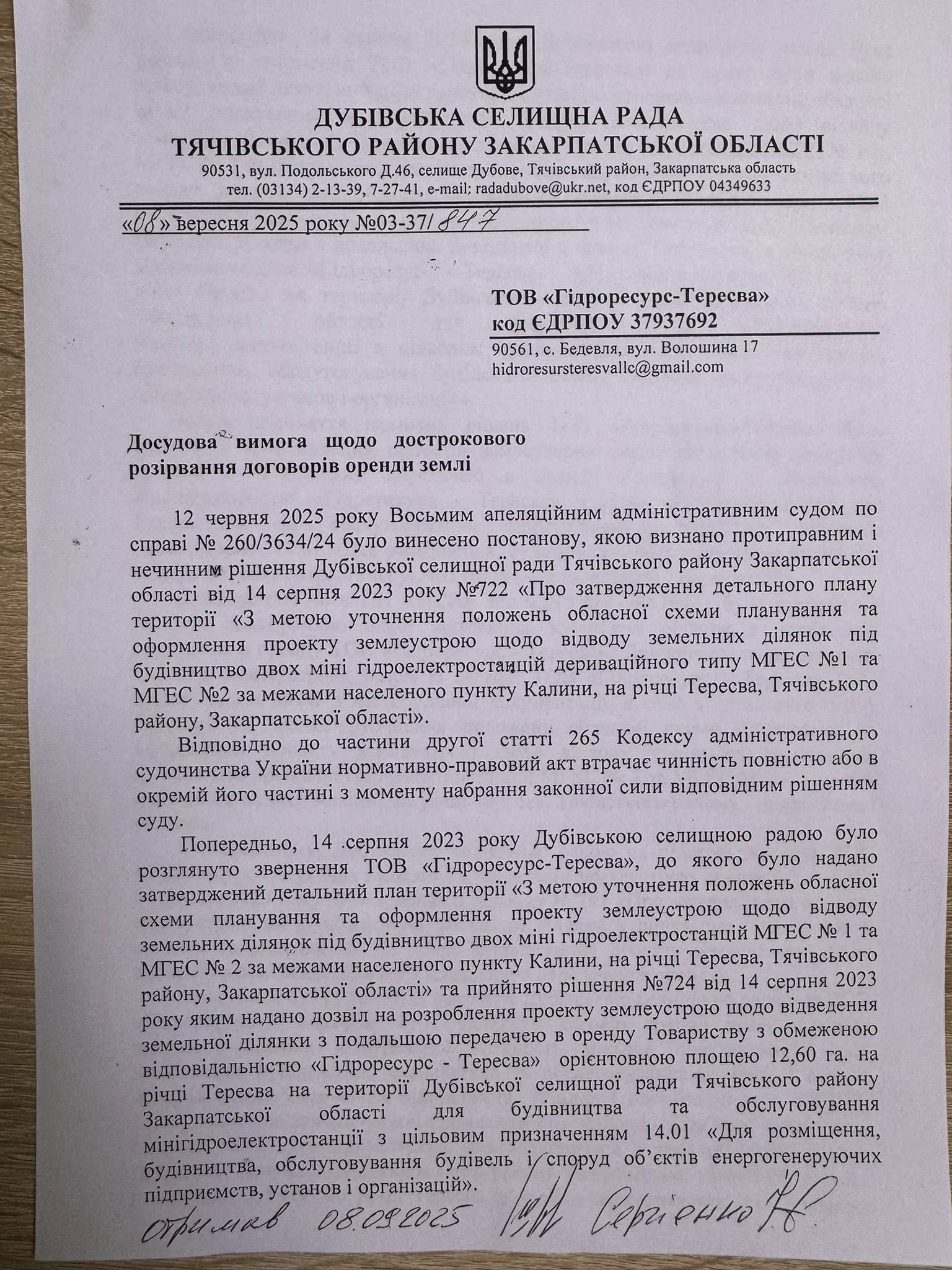 За результатами роботи робочої групи було прийнято важливе рішення: Дубівській селищній раді слід звернутися до ТОВ «Гідроресурс-Тересва» з досудовою вимогою щодо дострокового розірвання договорів оренди землі, що використовуються під будівництво міні-ГЕС №1 та №2 у селі Калини. Це крок спрямований на деескалацію конфліктної ситуації та врахування інтересів громади. У разі, якщо орендар відмовиться від дострокового розірвання договорів, Дубівська селищна рада матиме намір звернутися до суду для захисту своїх прав та інтересів мешканців.
