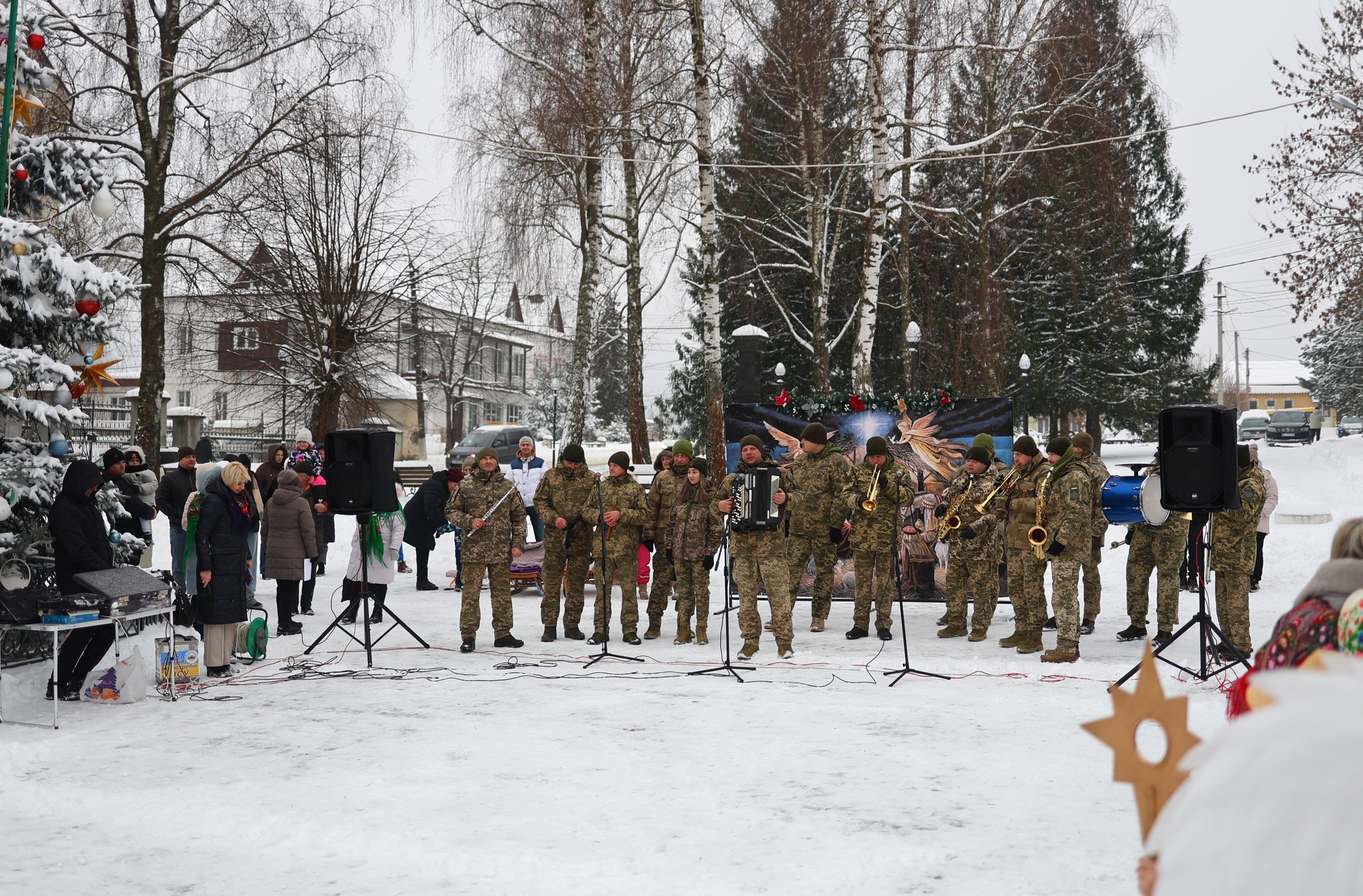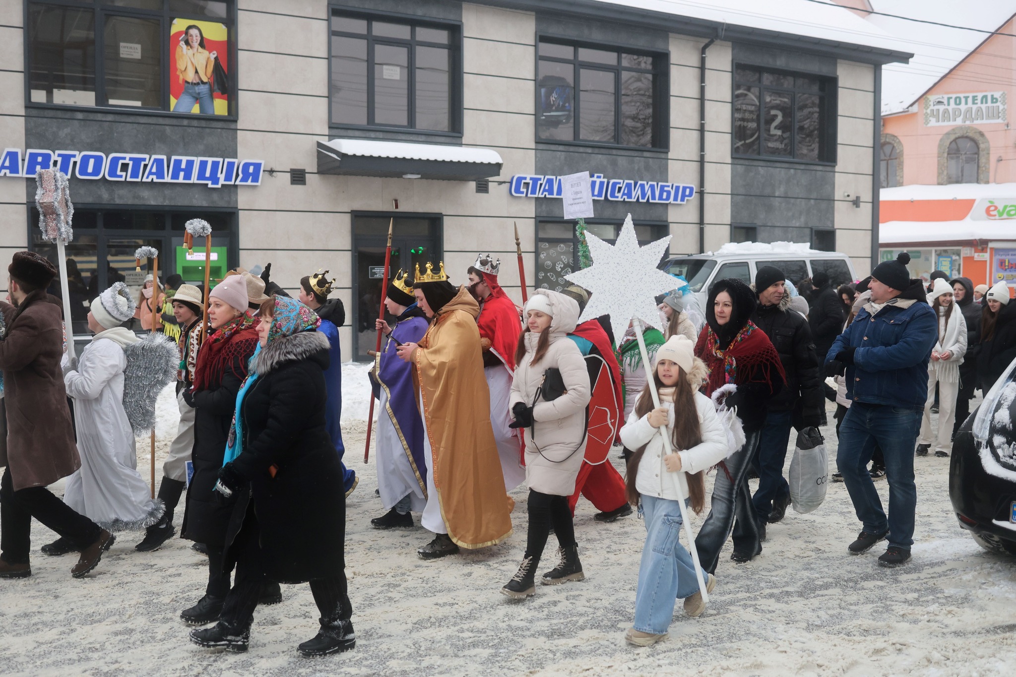 Піднесене святкування продовжилося урочистою ходою вертепів вулицями Старого Самбора. Колективи у супроводі військового духового оркестру 703-ї бригади пройшли до площі Героїв Небесної Сотні, де відбулася спільна коляда біля будівлі міської ради.
