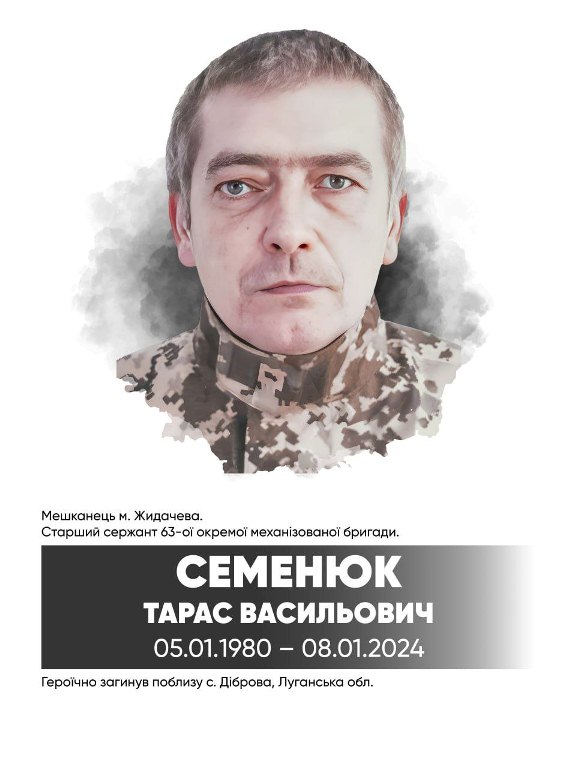 44-річний Воїн, старший сержант Тарас Семенюк – навідник 2 механізованого взводу 2 механізованої роти 63-ї окремої механізованої бригади Збройних Сил України загинув 8 січня 2024 року під час виконання бойового завдання поблизу села Діброва Сіверськодонецького району Луганської області, мужньо виконавши військовий обов’язок, в бою за Україну, її свободу і незалежність.