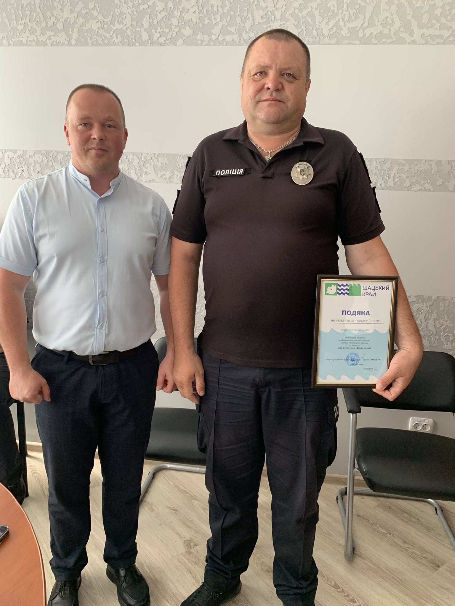 ✅8 липня під час засідання виконкому Богдан Тимошук, секретар селищної ради, оголосив подяки Євгену Шевчуку, дільничному офіцеру поліції, та Юлії Гуд, майору поліції, старшому інспектору сектору поліцейської діяльності № 2 (селище Шацьк) Ковельського РУП ГУНП у Волинській області.