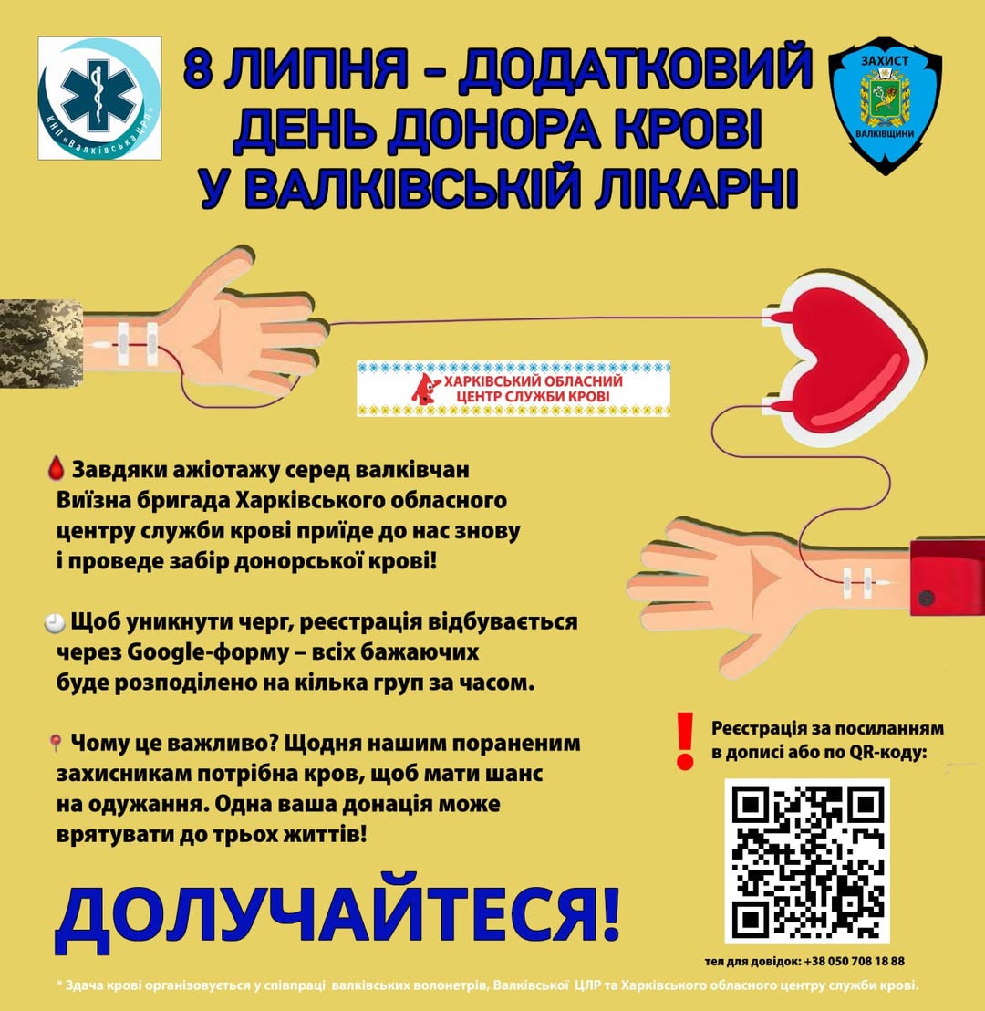 📅 8 липня 2025 року у Валківській ЦРЛ (3 поверх, колишнє пологове) виїзна бригада Харківської служби крові проведе збір крові для поранених військових та мешканців громади.