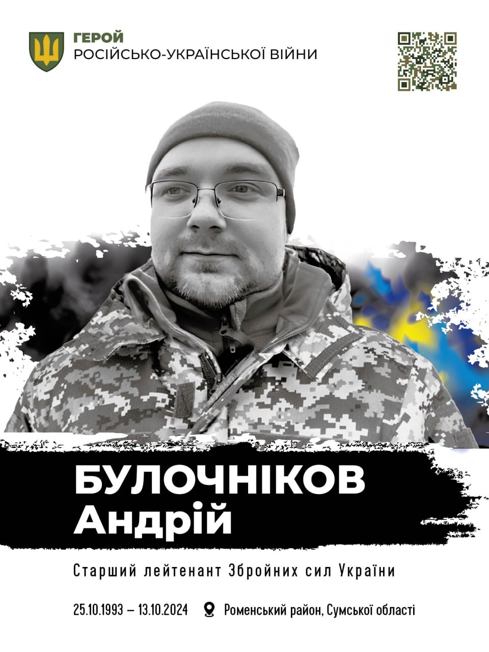 Сьогодні ми з глибоким сумом вшановуємо пам’ять старшого лейтенанта Збройних Сил України Андрія Булочнікова (25.10.1993 – 13.10.2024). Це непоправна втрата для нашої громади та всієї країни. Андрій був не просто захисником, а справжнім патріотом, який без вагань став на захист Батьківщини.