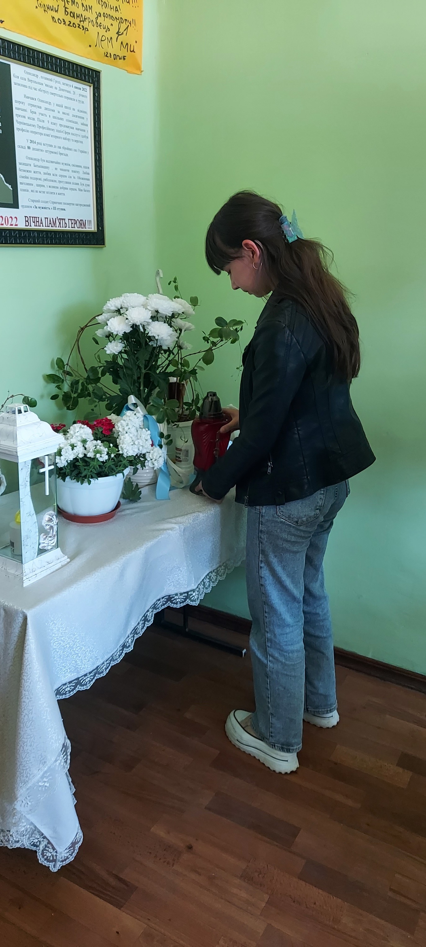Ми приносимо квіти до меморіальної дошки, щоб вшанувати його пам’ять. Він завжди буде в наших серцях. Він був справжнім патріотом і героєм.