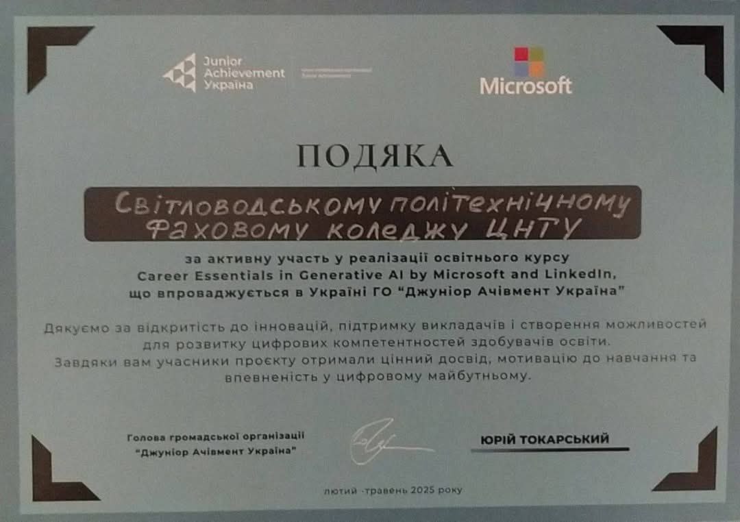 Особливо було відзначено ВСП “Світловодський політехнічний коледж ЦНТУ”, який представила викладачка Тамара Козенко. Її професіоналізм, ініціативність та відданість розвитку цифрової освіти сприяли тому, що коледж отримав визнання як один з найактивніших учасників курсу. Під час EdApp Graduation Day коледж було урочисто нагороджено, що стало заслуженим визнанням внеску Тамари Козенко та всього навчального закладу в популяризацію Generative AI.